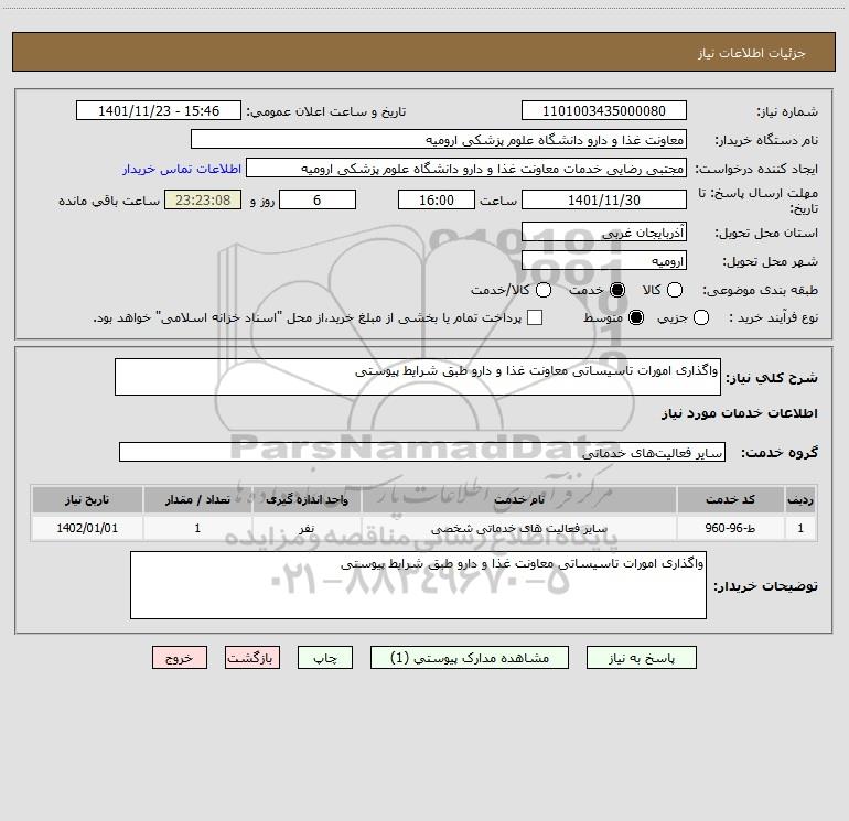 شرح کلی نیاز: واگذاری امورات تاسیساتی معاونت غذا و دارو طبق شرایط پیوستی