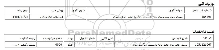 155191بست چهار پیچ جهت لوله داربستی 1.1/2 اینچ - ایران بستاستعلام الکترونیکی1401/11/24