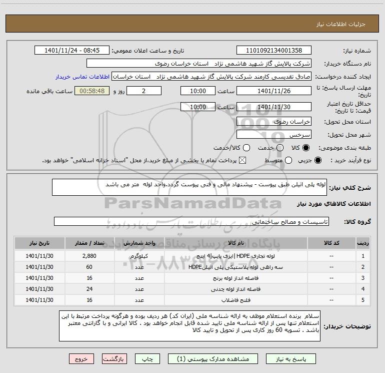 شرح کلی نیاز: لوله پلی اتیلن طبق پیوست - پیشنهاد مالی و فنی پیوست گردد.واحد لوله متر می باشد