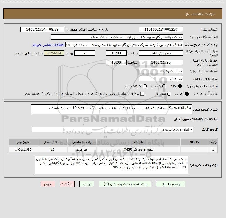 شرح کلی نیاز: ورق mdf به رنگ سفید پاک چوب - - پیشنهاد مالی و فنی پیوست گردد. تعداد 10 شیت میباشد .