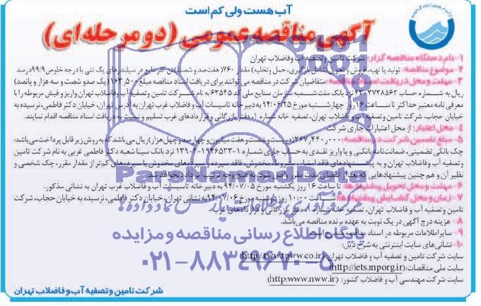 2- موضوع مناقصه : تولید یا تهیه ، فروش و تحویل (شامل بارگیری ، حمل و تخلیه ) مقدار 760 ( هفت صد و شصت ) تن کلر مابع در سیلندرهای یک تنی با درجه خلوص 99/9 درصد