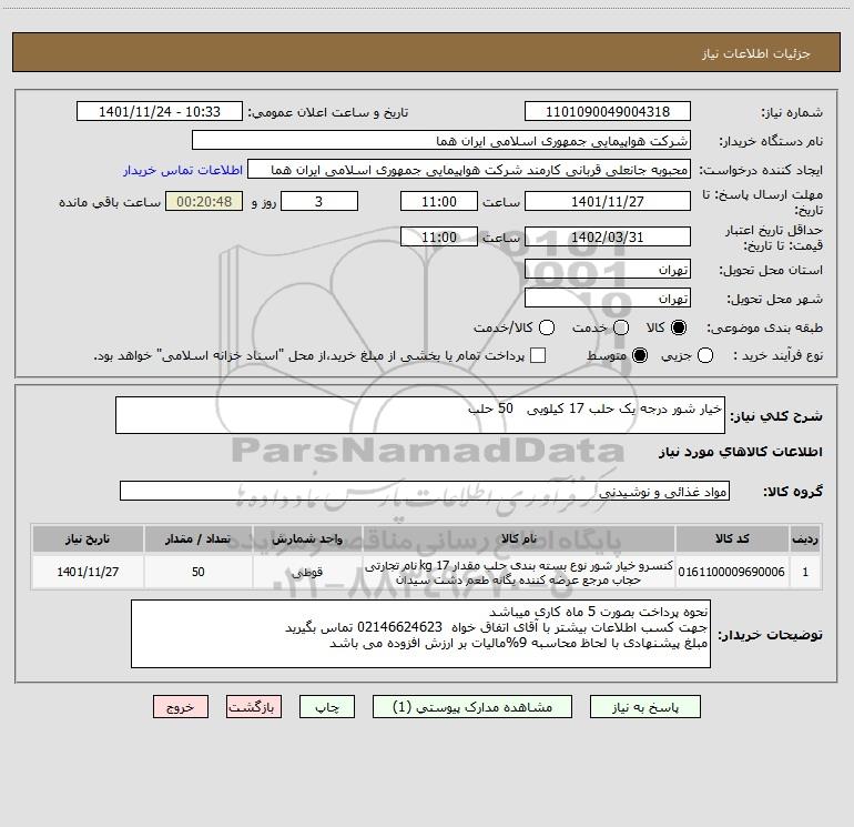 شرح کلی نیاز: خیار شور درجه یک حلب 17 کیلویی 50 حلب