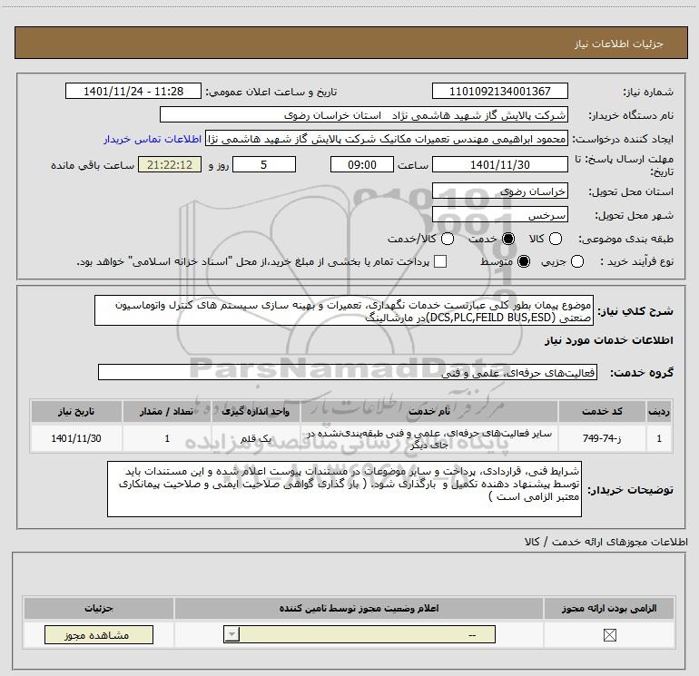 نام دستگاه خریدار:شرکت پالایش گاز شهید هاشمی نژاد استان خراسان رضوی