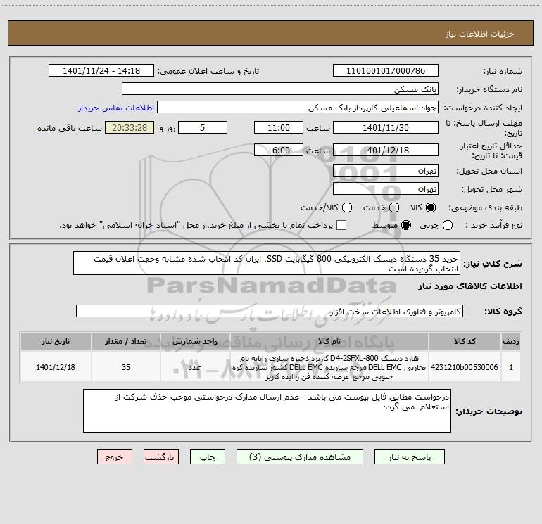 شرح کلی نیاز: خرید 35 دستگاه دیسک الکترونیکی 800 گیگابایت SSD، ایران کد انتخاب شده مشابه وجهت اعلان قیمت انتخاب گردیده است