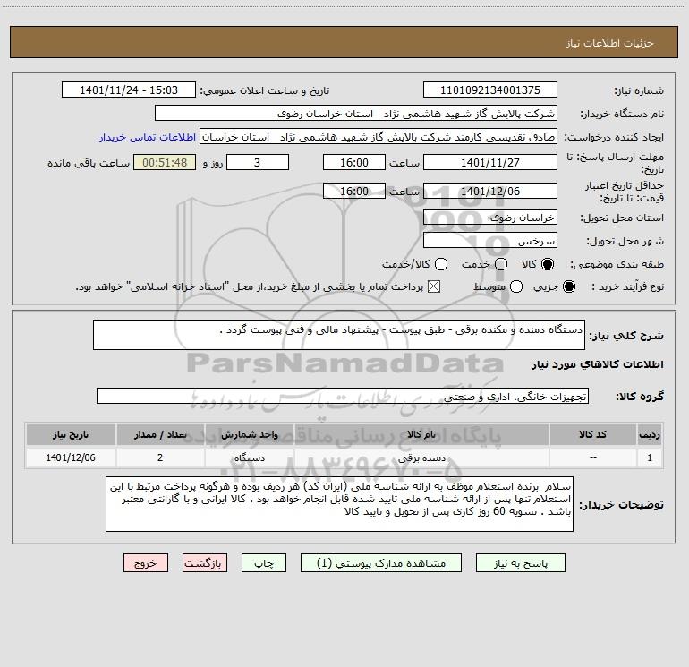 نام دستگاه خریدار:شرکت پالایش گاز شهید هاشمی نژاد استان خراسان رضوی