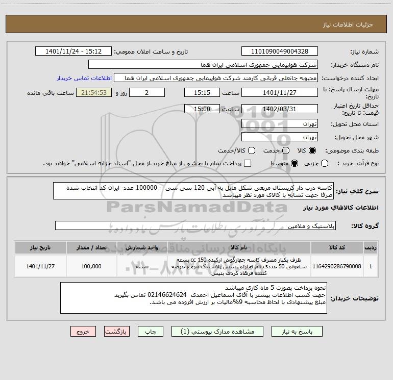 شرح کلی نیاز: کاسه درب دار کریستال مربعی شکل مایل به آبی 120 سی سی - 100000 عدد- ایران کد انتخاب شده صرفا جهت تشابه با کالای مورد نظر میباشد