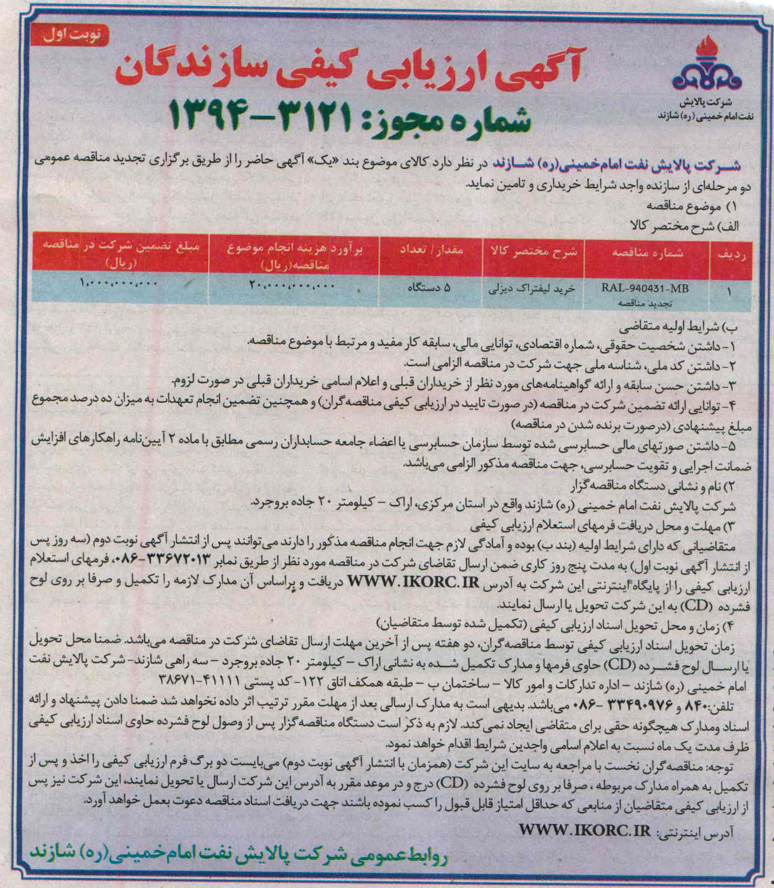 مناقصه خرید لیفتراک دیزلی, آگهی ارزیابی کیفی , مناقصه خرید لیفتراک دیزلی