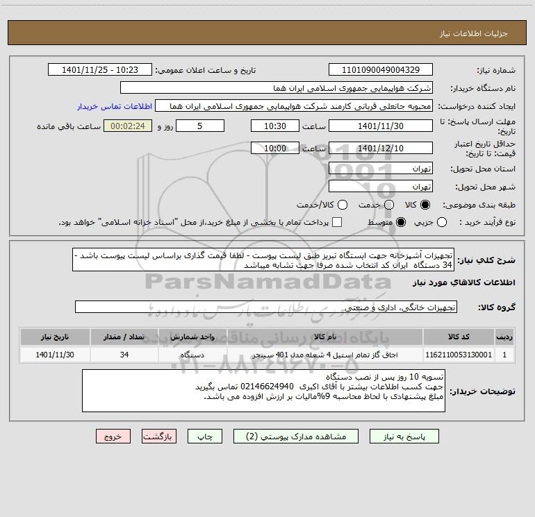 شرح کلی نیاز: تجهیزات آشپزخانه جهت ایستگاه تبریز طبق لیست پیوست - لطفا قیمت گذاری براساس لیست پیوست باشد -34 دستگاه ایران کد انتخاب شده صرفا جهت تشابه میباشد