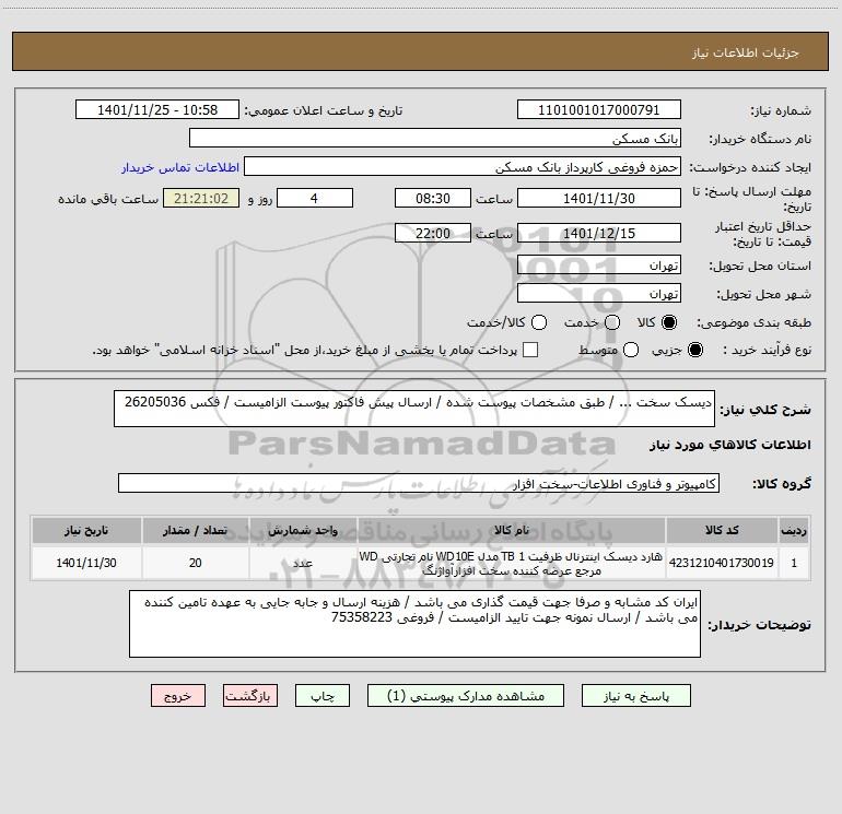 شرح کلی نیاز: دیسک سخت ... / طبق مشخصات پیوست شده / ارسال پیش فاکتور پیوست الزامیست / فکس 26205036