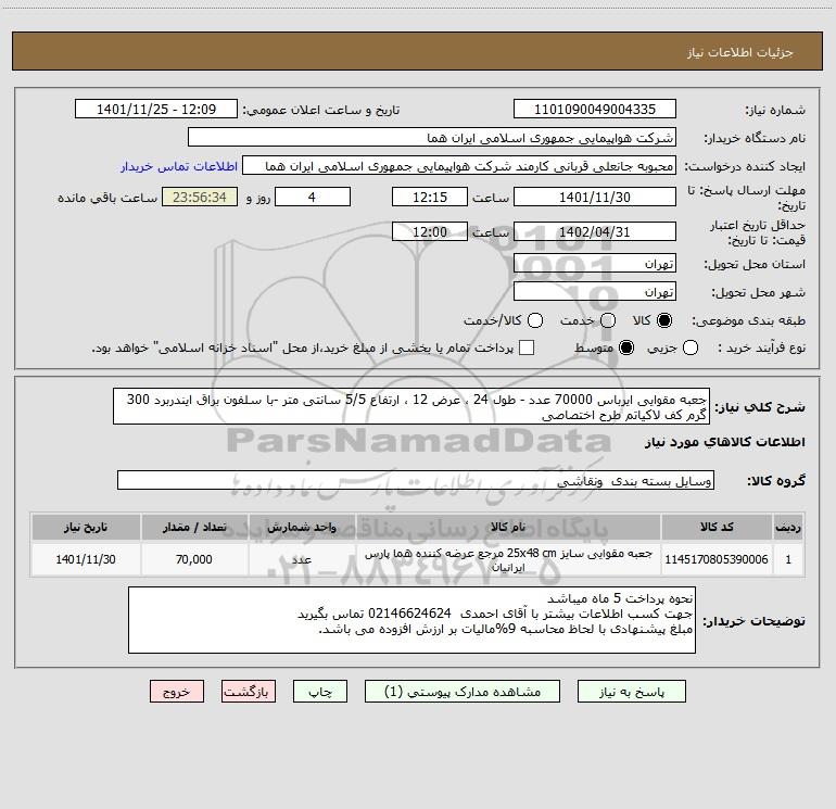 شرح کلی نیاز: جعبه مقوایی ایرباس 70000 عدد - طول 24 ، عرض 12 ، ارتفاع 5/5 سانتی متر -با سلفون براق ایندربرد 300 گرم کف لاکیاتم طرح اختصاصی
