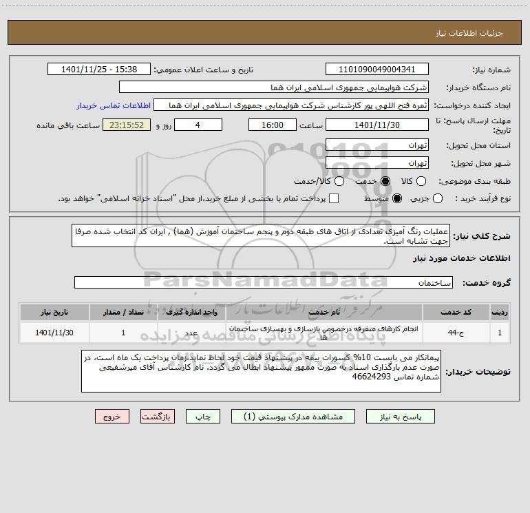 شرح کلی نیاز: عملیات رنگ آمیزی تعدادی از اتاق های طبقه دوم و پنجم ساختمان آموزش (هما) , ایران کد انتخاب شده صرفا جهت تشابه است.