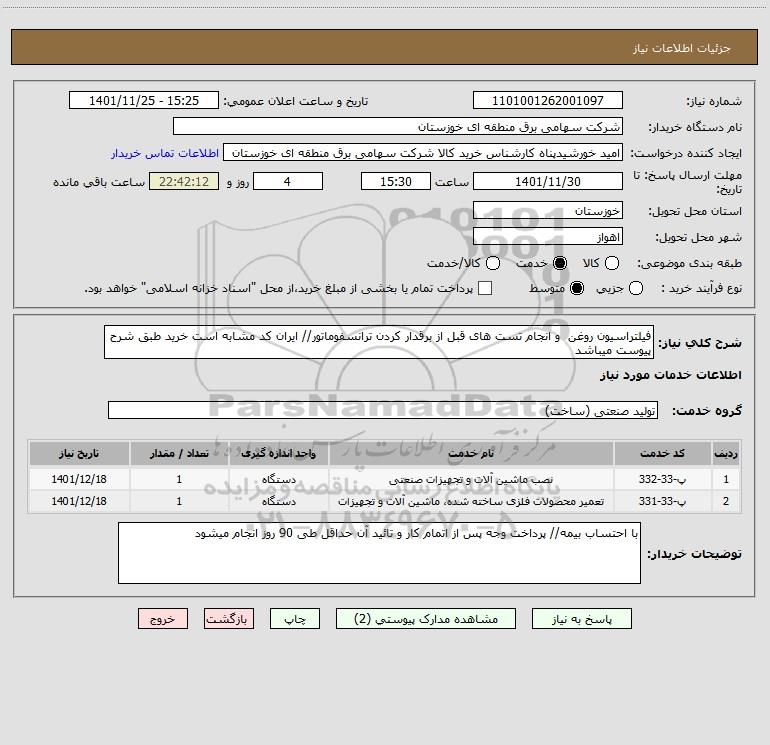 شرح کلی نیاز: فیلتراسیون روغن و انجام تست های قبل از برقدار کردن ترانسفوماتور// ایران کد مشابه است خرید طبق شرح پیوست میباشد