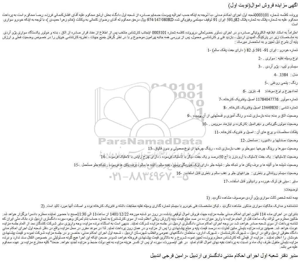 احتراماً به استناد ابلاغیه الکترونیکی صادره و در اجرای دستور حضرتعالی درپرونده کلاسه شماره 0003101 اینجانب کارشناس منتخب پس از اطلاع از مفاد قرار صادره از اتاق ، بدنه و موتور یکدستگاه سواری پژو آردی به مشخصات زیر در پارکینگ المهدی اردبیل ، بازدید فنی و کارشناسی معمول، پس از بررسی همه جانبه پیرامون موضوع و با در نظر گرفتن جمیع جهات ، نظریه کارشناسی خویش را در خصوص وضعیت فعلی و ارزش پایه آن بشرح ذیل تعیین و به استحضار میرساند :
