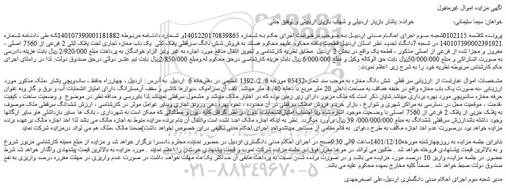 پرونده کلاسه 0102115شعبه سوم اجرای احکام مدنی اردبیل به موجب درخواست اجرای حکم به شماره 1401220170839865و شماره دادنامه مربوطه 140107390001181882که طی دادنامه شماره 140107390002391921 در شعبه 7دادگاه تجدید نظر استان اردبیل قطعیت یافته محکوم علیهم محکوم هستند به فروش شش دانگ سرقفلی پلاک ثبتی  یک باب مغازه تجاری تحت پلاک ثبتی 2 فرعی از 7560 اصلی ، مفروز و مجزا شده از فرعی از اصلی مذکور ، قطعه یک واقع در بخش 2 اردبیل  مطابق نظریه کارشناسی و تجویز انتقال منافع مورد اجاره به غیر ونیز الزام خواندگان به پرداخت مبلغ 2/920/000 ریال بابت هزینه دادرسی به صورت اشتراکی و مبلغ 50/000/000ریال بابت حق الوکاله وکیل و مبلغ 6/000/000 ریال بابت هزینه کارشناسی درحق محکوم له.ومبلغ 2/850/000ریال بابت نیم عشر دولتی درحق صندوق دولت. لذا در راستای اجرای حکم کارشناس مربوطه نظریه خود را به شرح زیر اعلام نمودند:
