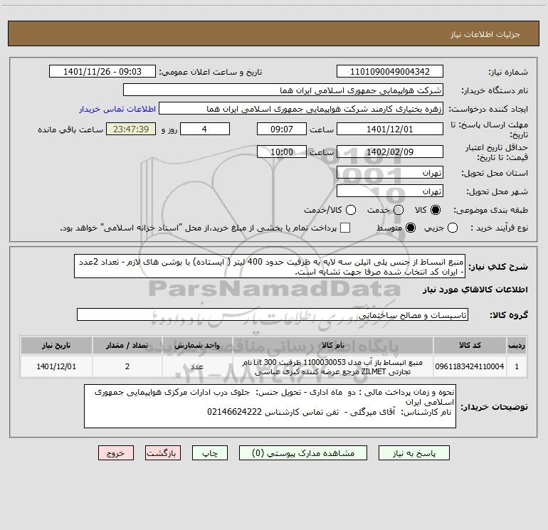 شرح کلی نیاز: منبع انبساط از جنس پلی اتیلن سه لایه به ظرفیت حدود 400 لیتر ( ایستاده) با بوشن های لازم - تعداد 2عدد - ایران کد انتخاب شده صرفا جهت تشابه است.