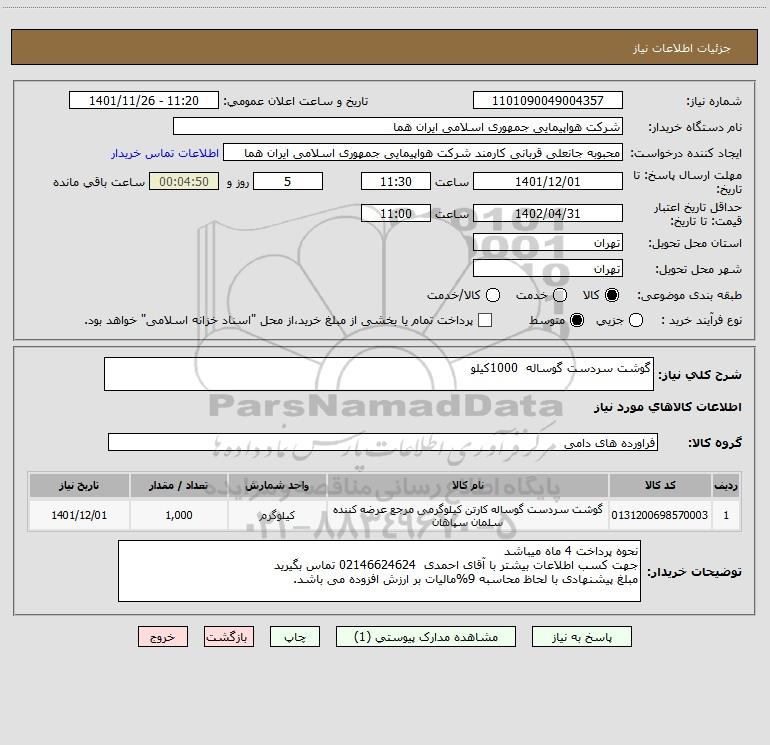شرح کلی نیاز: گوشت سردست گوساله 1000کیلو