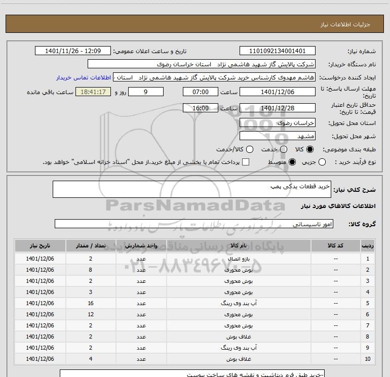 شرح کلی نیاز: خرید قطعات یدکی پمپ