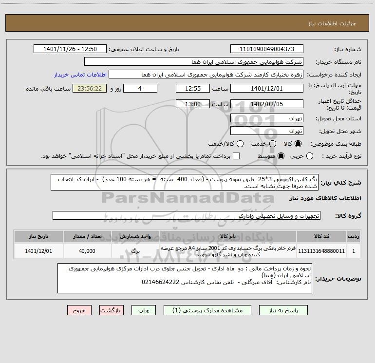 شرح کلی نیاز: تگ کابین اکونومی 3*25 طبق نمونه پیوست - (تعداد 400 بسته = هر بسته 100 عدد) - ایران کد انتخاب شده صرفا جهت تشابه است.