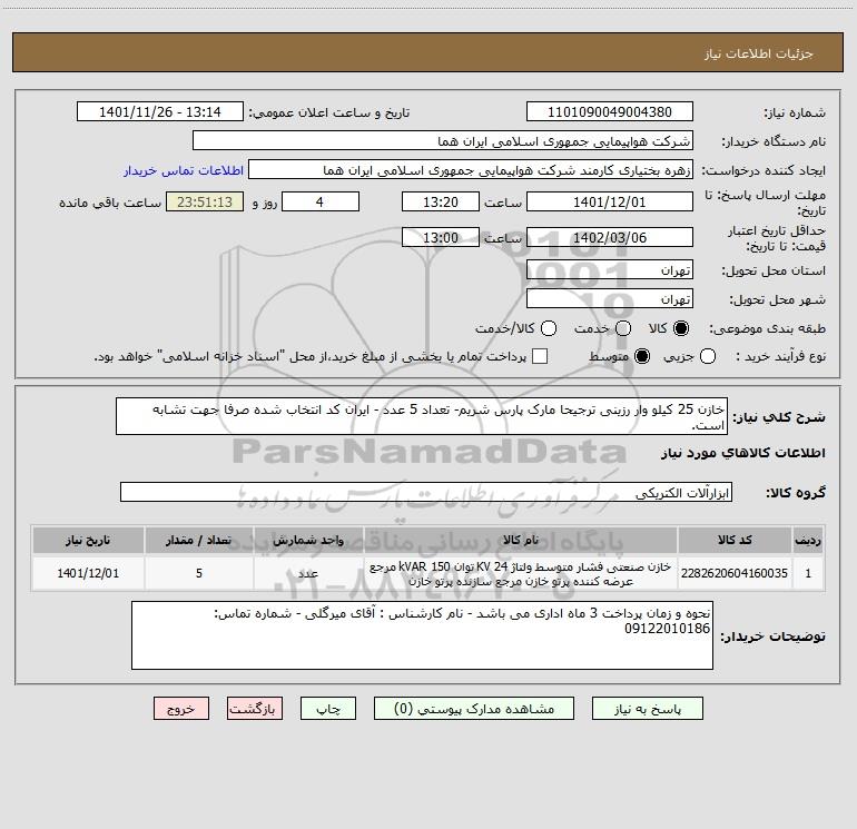 شرح کلی نیاز: خازن 25 کیلو وار رزینی ترجیحا مارک پارس شریم- تعداد 5 عدد - ایران کد انتخاب شده صرفا جهت تشابه است.
