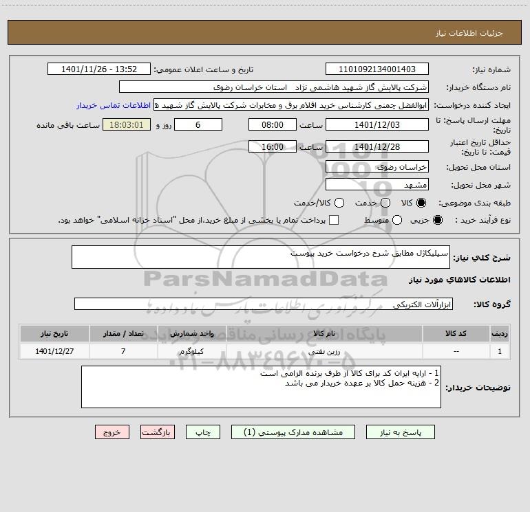 نام دستگاه خریدار:شرکت پالایش گاز شهید هاشمی نژاد استان خراسان رضوی