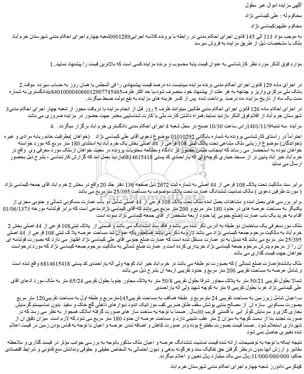 به موجب مواد 113 الی 145 قانون اجرای احکام مدنی در رابطه با پرونده کلاسه اجرایی0001289شعبه چهارم اجرای احکام مدنی شهرستان خرم آباد ملک با مشخصات ذیل از طریق مزایده به فروش میرسد