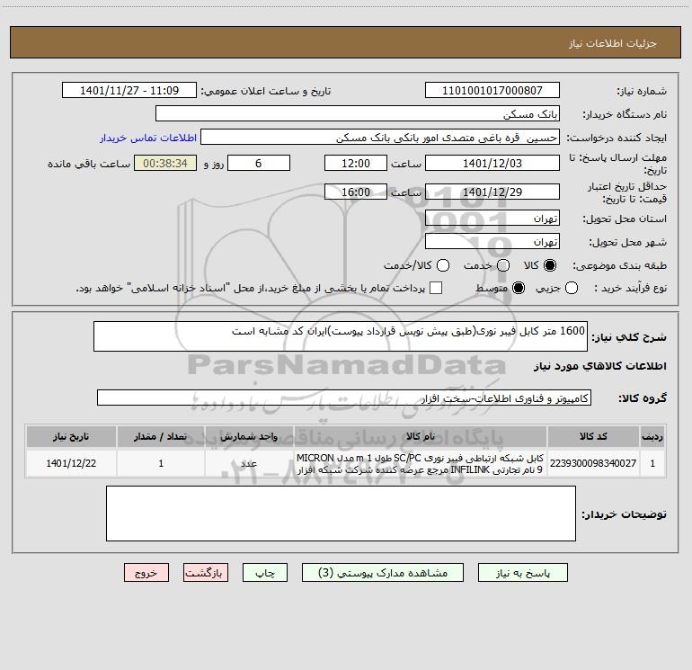 شرح کلی نیاز: 1600 متر کابل فیبر نوری(طبق پیش نویس قرارداد پیوست)ایران کد مشابه است