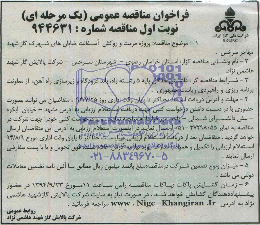 نام و نشانی مناقصه گزار: استان خراسان رضوی، شهرستان سرخس، شرکت پالایش گاز شهید هاشمی نژاد