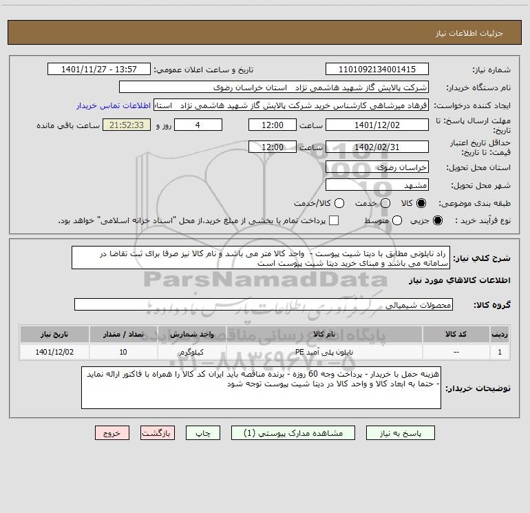 نام دستگاه خریدار:شرکت پالایش گاز شهید هاشمی نژاد استان خراسان رضوی