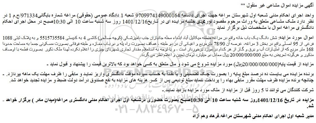 "آگهی مزایده اموال مشاعی غیر منقول "