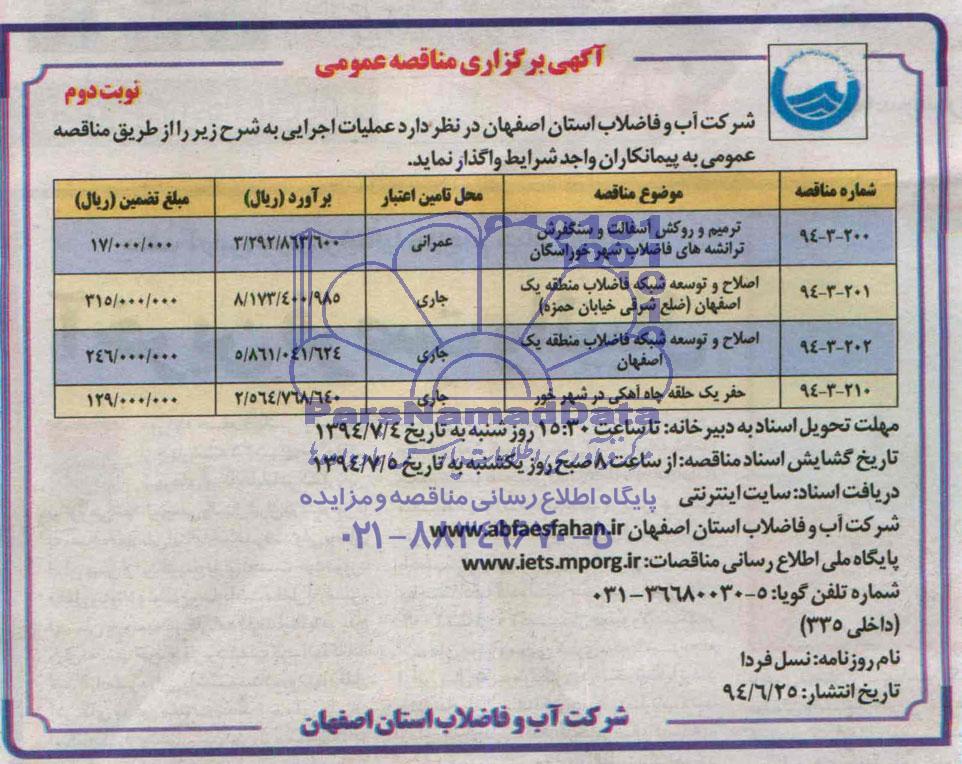 شرکت آب و فاضلاب استان اصفهان در نظر دارد عملیات اجرایی به شرح زیر را از طریق مناقصه عمومی به پیمانکاران واجد شرایط واگذار نماید.