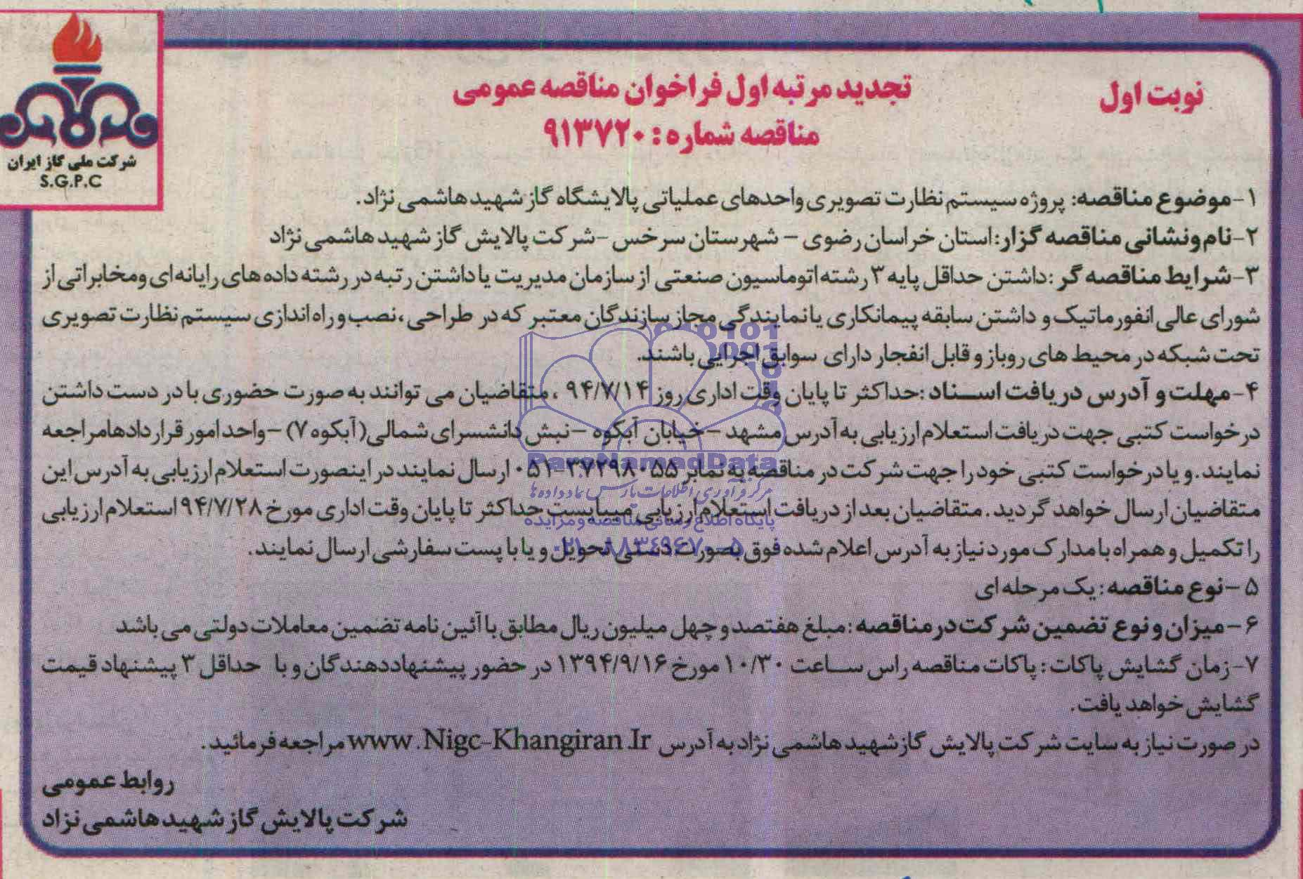 تجدید مناقصه پروژه سیستم نظارت تصویری واحدهای عملیاتی پالاشگاه گاز , تجدید فراخوان مناقصه عمومی, تجدید مناقصه پروژه سیستم نظارت تصویری واحدهای عملیاتی پالاشگاه گاز