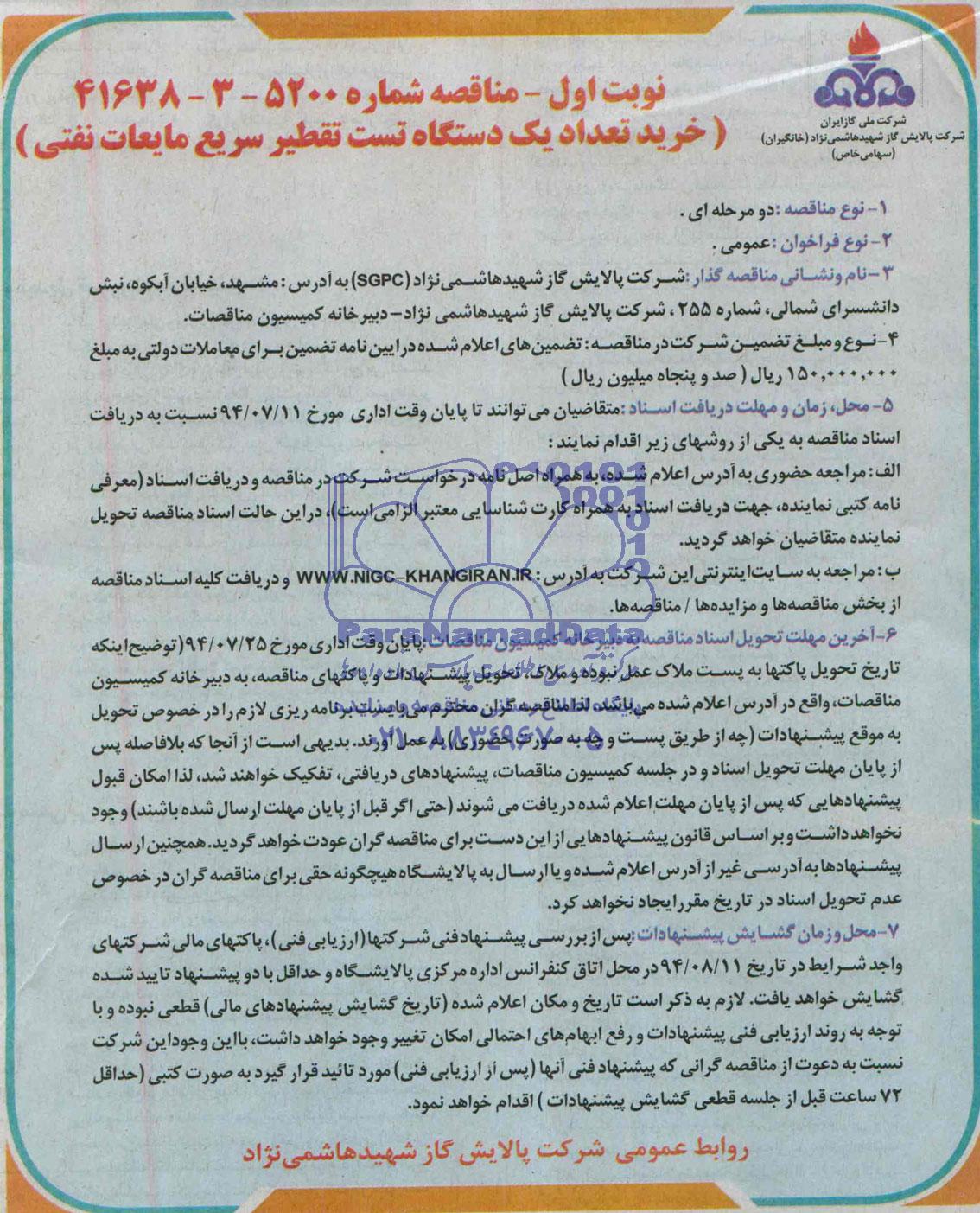 مناقصه خرید تعداد یکدستگاه تست تقطیر سریع مایعات نفتی از کلیه افراد متخصص و شرکتها واجد شرایط دعوت به عمل میآید در مناقصه با کد خبرگزاری پارس نماد: 553064 شرکت نمایند.