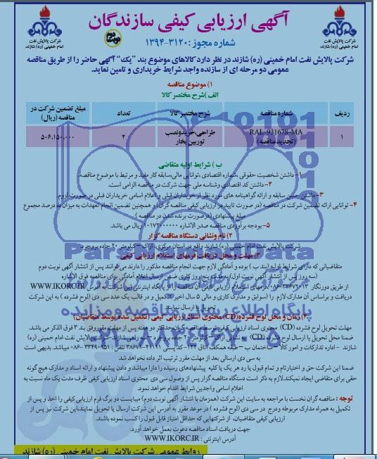 شرکت پالایش نفت امام خمینی (ره) شازند در نظر دارد کالاهای موضوع بند یک آگهی حاضر را از طریق برگزاری مناقصه عمومی دو مرحله ای از تامین کننده واجد شرایط خریداری نماید