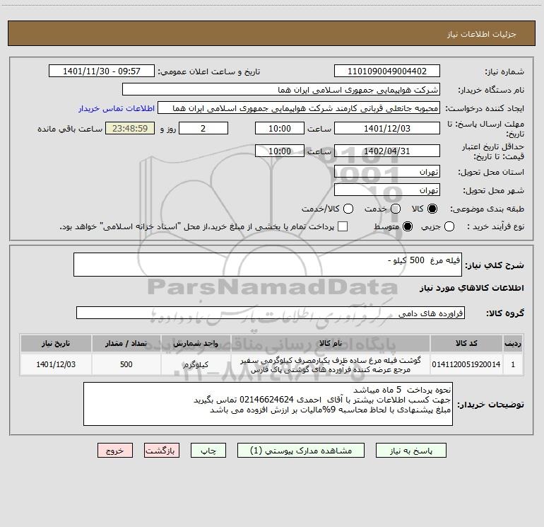 شرح کلی نیاز: فیله مرغ 500 کیلو -