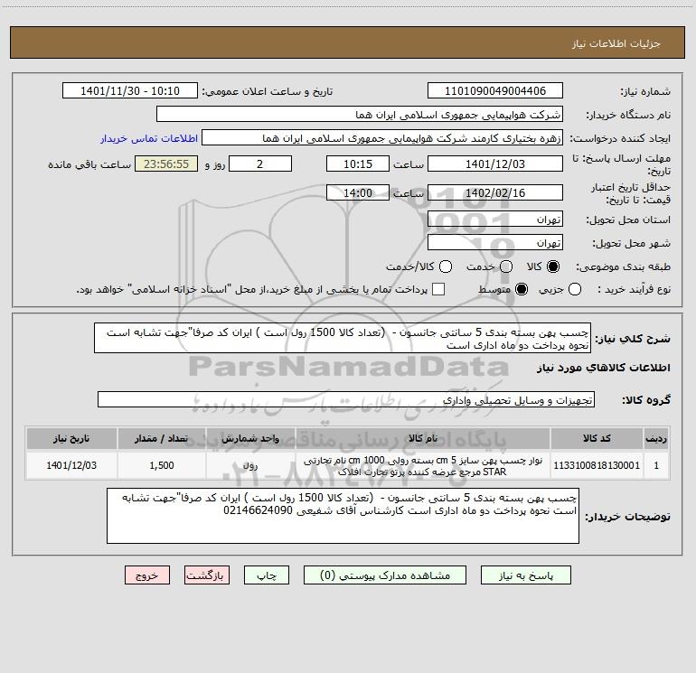 شرح کلی نیاز: چسب پهن بسته بندی 5 سانتی جانسون - (تعداد کالا 1500 رول است ) ایران کد صرفا"جهت تشابه است نحوه پرداخت دو ماه اداری است