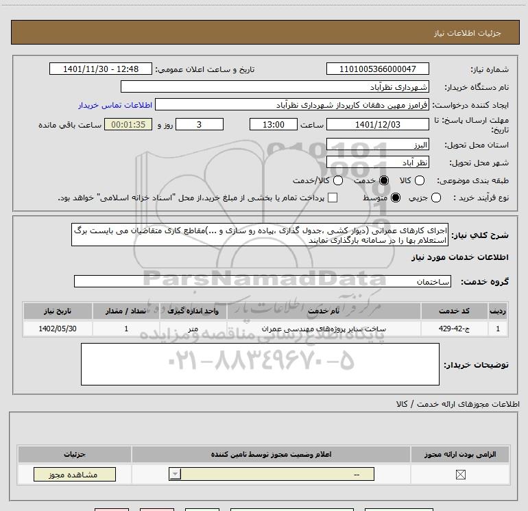 شرح کلی نیاز: اجرای کارهای عمرانی (دیوار کشی ،جدول گذاری ،پیاده رو سازی و ...)مقاطع کاری متقاضیان می بایست برگ استعلام بها را در سامانه بارگذاری نمایند