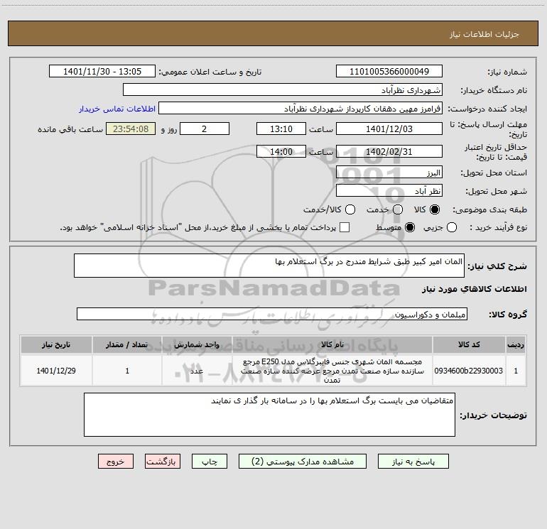 شرح کلی نیاز: المان امیر کبیر طبق شرایط مندرج در برگ استعلام بها