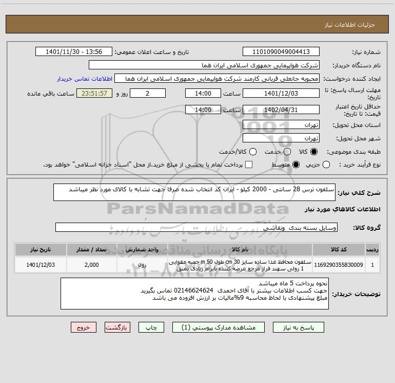 شرح کلی نیاز: سلفون ترس 28 سانتی - 2000 کیلو - ایران کد انتخاب شده صرفا جهت تشابه با کالای مورد نظر میباشد