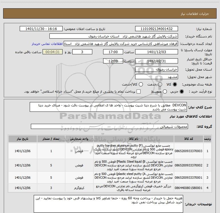 نام دستگاه خریدار:شرکت پالایش گاز شهید هاشمی نژاد استان خراسان رضوی