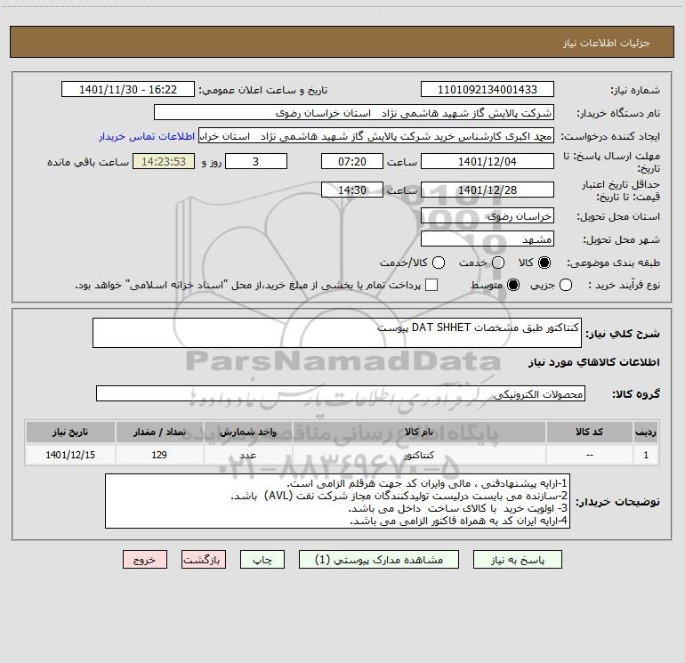 نام دستگاه خریدار:شرکت پالایش گاز شهید هاشمی نژاد استان خراسان رضوی