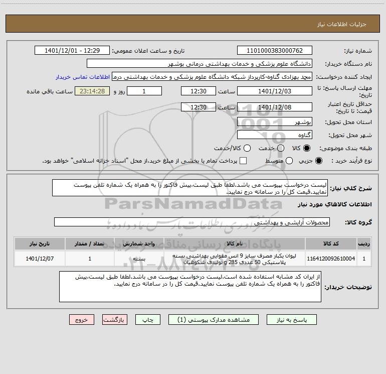 شرح کلی نیاز: لیست درخواست بپیوست می باشد.لطفا طبق لیست،پیش فاکتور را به همراه یک شماره تلفن پیوست نمایید.قیمت کل را در سامانه درج نمایید.