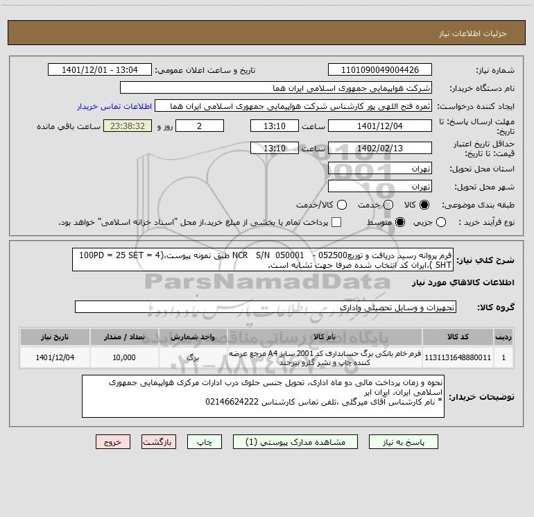 استعلام فرم پروانه رسید دریافت و توزیعNCR S/N 050001 - 052500 طبق نمونه پیوست،(100PD = 25 SET = 4 SHT )،ایران کد انتخاب شده صرفا جهت تشابه است., استعلام فرم پروانه رسید دریافت و توزیعNCR S/N 050001 - 052500 طبق نمونه پیوست،(100PD = 25 SET = 4 SHT )،ایران کد انتخاب شده صرفا جهت تشابه است.
