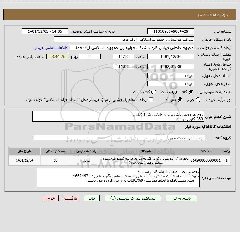 شرح کلی نیاز: تخم مرغ صورت شده زرده طلایی 12.5 کیلویی 360 کارتن در ماه
