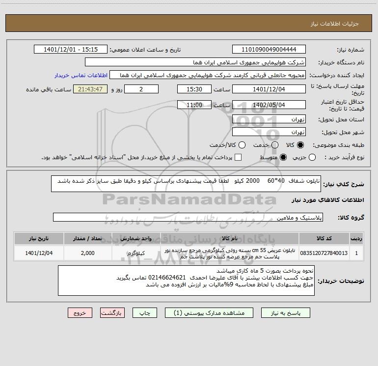 شرح کلی نیاز: نایلون شفاف 40*60 2000 کیلو لطفا قیمت پیشنهادی براساس کیلو و دقیقا طبق سایز ذکر شده باشد