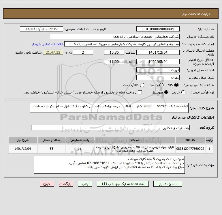 شرح کلی نیاز: نایلون شفاف 65*95 2000 کیلو لطفاقیمت پیشنهادی بر اساس کیلو و دقیقا طبق سایز ذکر شده باشد