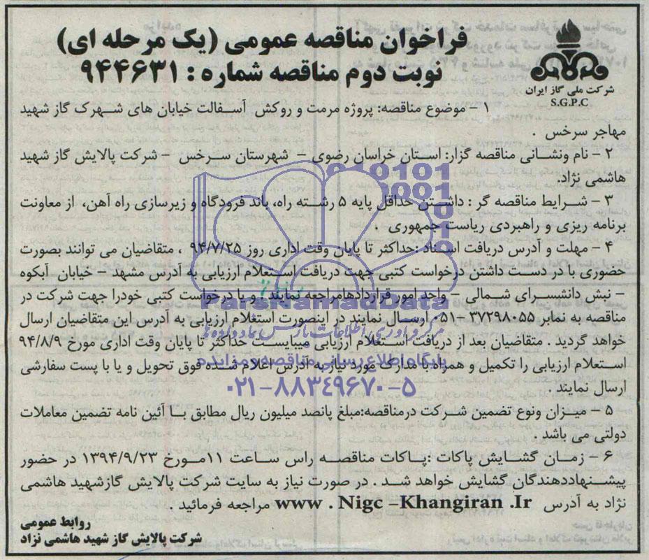 نام و نشانی مناقصه گزار: استان خراسان رضوی، شهرستان سرخس، شرکت پالایش گاز شهید هاشمی نژاد