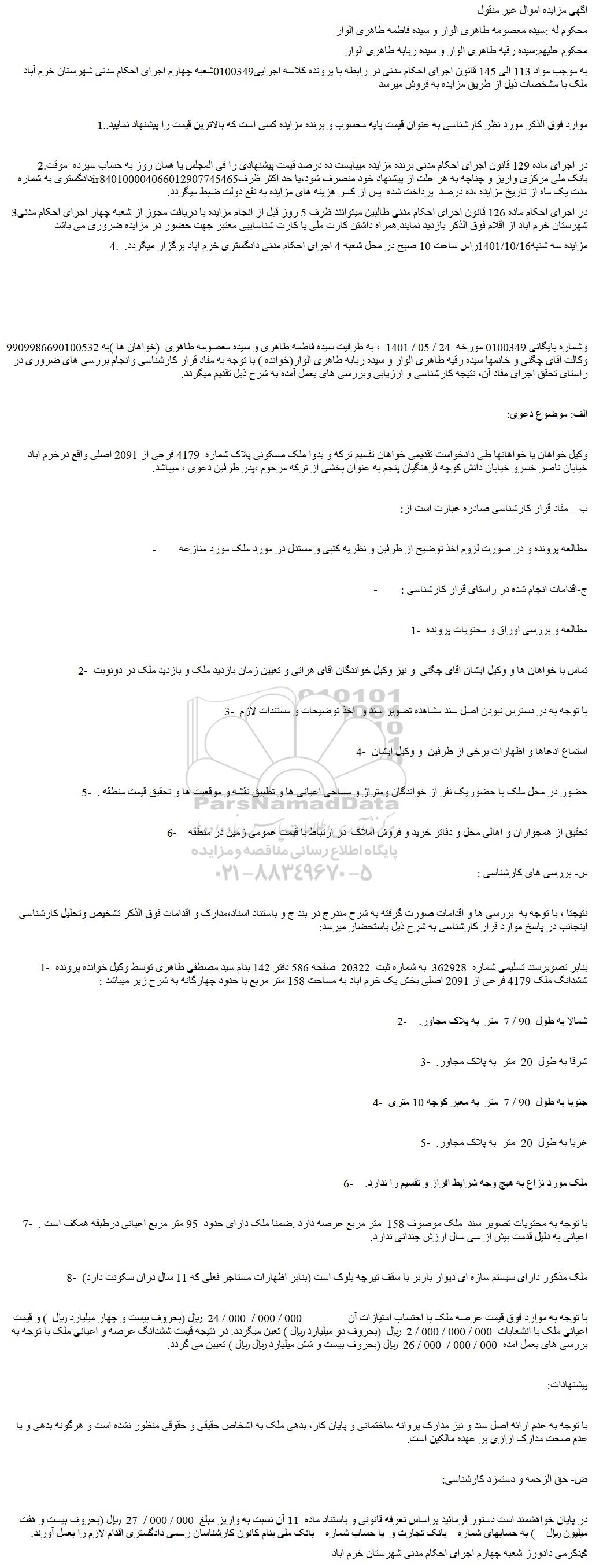 به موجب مواد 113 الی 145 قانون اجرای احکام مدنی در رابطه با پرونده کلاسه اجرایی0100349شعبه چهارم اجرای احکام مدنی شهرستان خرم آباد ملک با مشخصات ذیل از طریق مزایده به فروش میرسد