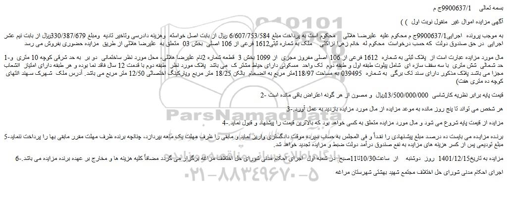 به موجب پرونده اجرایی9900637/1ج م محکوم علیه علیرضا هلالی محکوم است به پرداخت مبلغ 6/607/753/584 ریال از بابت اصل خواسته وهزینه دادرسی وتاخیر تادیه ومبلغ 330/387/679ریال از بابت نیم عشر اجرایی در حق صندوق دولت که حسب درخواست محکوم له خانم زهرا نزاکتی ملک به شماره ثبتی1612 فرعی از 106 اصلی بخش 03 متعلق به علیرضا هلالی از طریق مزایده حضوری بفروش می رسد