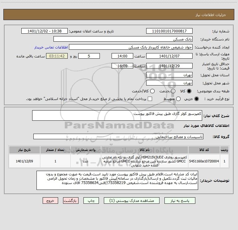 شرح کلی نیاز: کمپرسور کولر گازی طبق پیش فاکتور پیوست