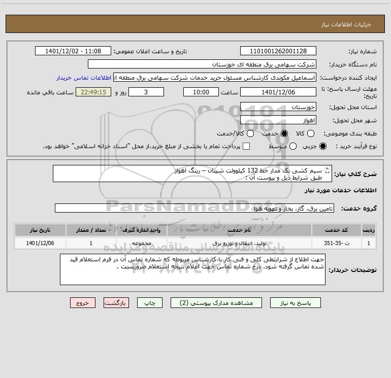 شرح کلی نیاز: سیم کشی یک مدار خط 132 کیلوولت شیبان – رینگ اهواز